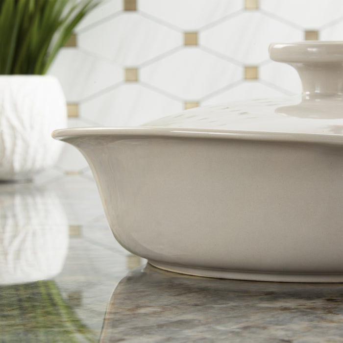 - Set includes covered casseroles 4.5qt., and 2.4qt. Crafted from durable stoneware, this high-quality non-porous ceramic that ensures even baking.
