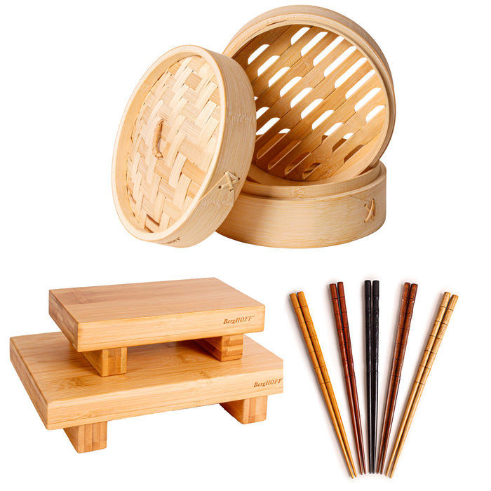 Serve and prepare your sushi in style. Beautifully made sushi deserves a high-quality place setting, like these bamboo sushi tray. You are guaranteed to impress your guests. The steamer lets you easily cook vegetables, dim sum, dumplings, or even seafood without losing any of the original flavor. For noodle dishes, sushi or dim sum, these Multi Colored Chopsticks are our go-to utensils! Made of lightweight Bamboo, these 9" Chopsticks are perfect for large meals shared with friends and family, for auspicious occasions and Chinese New Year. Made with natural bamboo. Eco-friendly bamboo is a sustainable material that grows quickly and does not require harmful pesticides or fertilizers, making it a great choice for those who are conscious about the environment. Set includes 7" Steamer, 8" Sushi Tray, 10.5" Sushi Tray, 9" Chopsticks (5 pairs)
