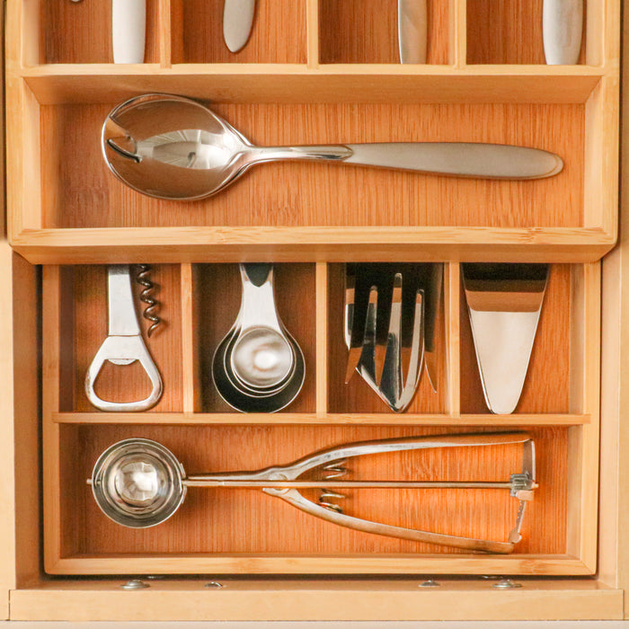 2pc set of 5-slot flatware organizers. Made from high-quality bamboo, this organizer is not only durable but also environmentally friendly. The natural bamboo finish adds a touch of elegance to your kitchen decor, while the 5 slots provide ample space to store your flatware in an organized manner. This organizer is compact enough to fit in most drawers while still offering plenty of storage space. Its designed to accommodate various types of flatware, including forks, knives, spoons, and other utensils while its sturdy construction ensures that this organizer will last for years to come, providing a reliable storage solution for your flatware. Whether you are looking to declutter your kitchen drawers or simply want to keep your flatware neatly organized, this 5-slot flatware organizer is the perfect solution.