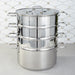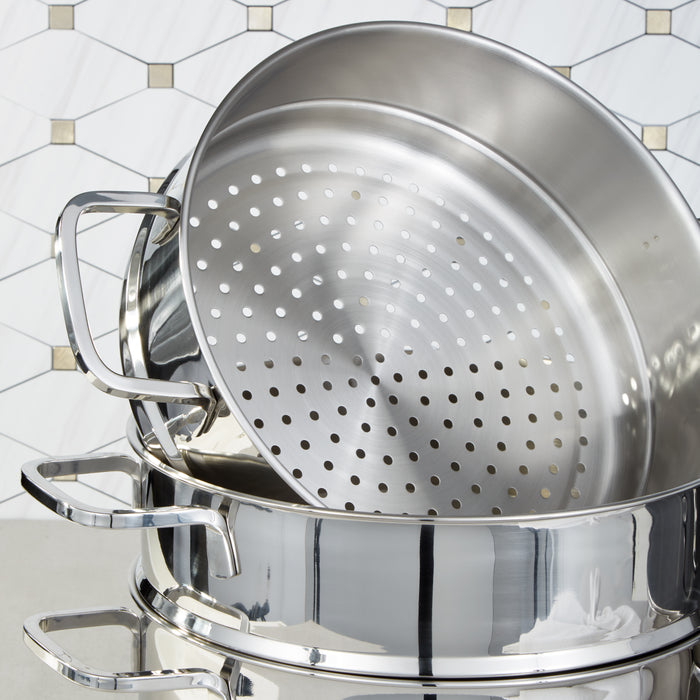 - This steamer set includes recycled 18/10 stainless steel 11" Stockpot 9qt. and 3x steamer inserts 11" with wide, ergonomic handles and a matching glass lid.