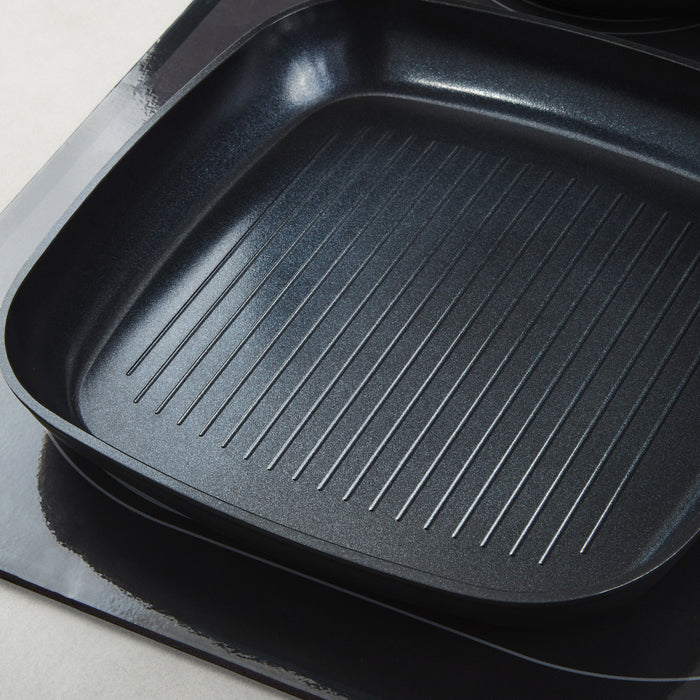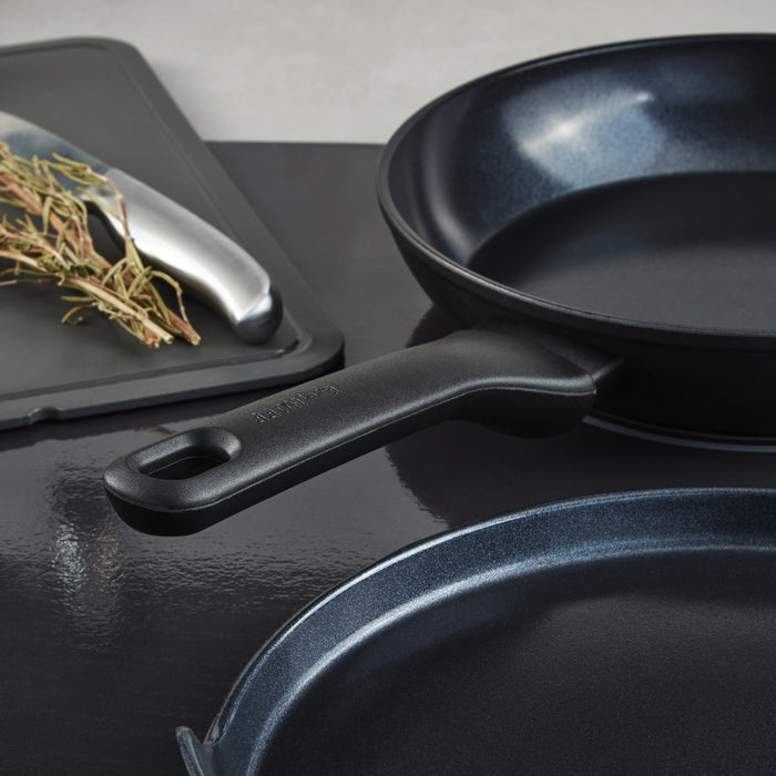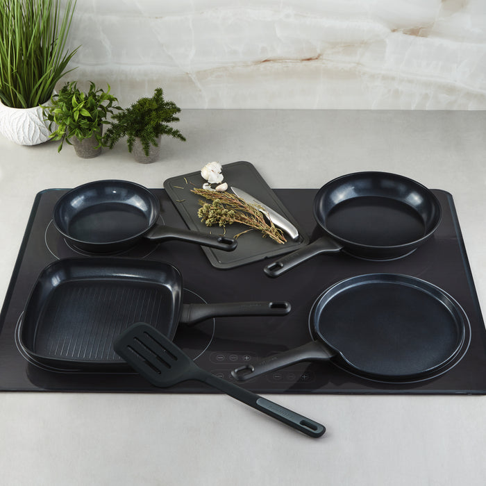 DiNA Helix 5pc Cookware Set with Slotted Turner is a must-have, eco-friendly set for any kitchen. These frying pans are perfect for preparing breakfast in the morning or dinner in the evening. The grill pan is the perfect companion for your favorite searing dishes, while the pancake pan will help you prepare a hearty or sweet treat! The recycled aluminum body ensures great, even heat distribution and the high-quality, healthy CeraGreen non-stick, nontoxic PFAS-free and PTFE-free ceramic coating means you need little to no oil and the pan is easy to clean. The pans are also suitable for any kind of cooktop, including induction. The slotted turner included in the set is gentle on the non-stick coating, preventing scratches and ensuring the longevity of your cookware. Whether you are a seasoned chef or just starting out in the kitchen, this non-stick cookware set is a versatile and practical addition to your cooking arsenal. Package includes: 8" Fry Pan, 9.5" Fry Pan, 10.25" Grill Pan, 10" Pancake Pan, and Nylon with silicone overmold Slotted turner.