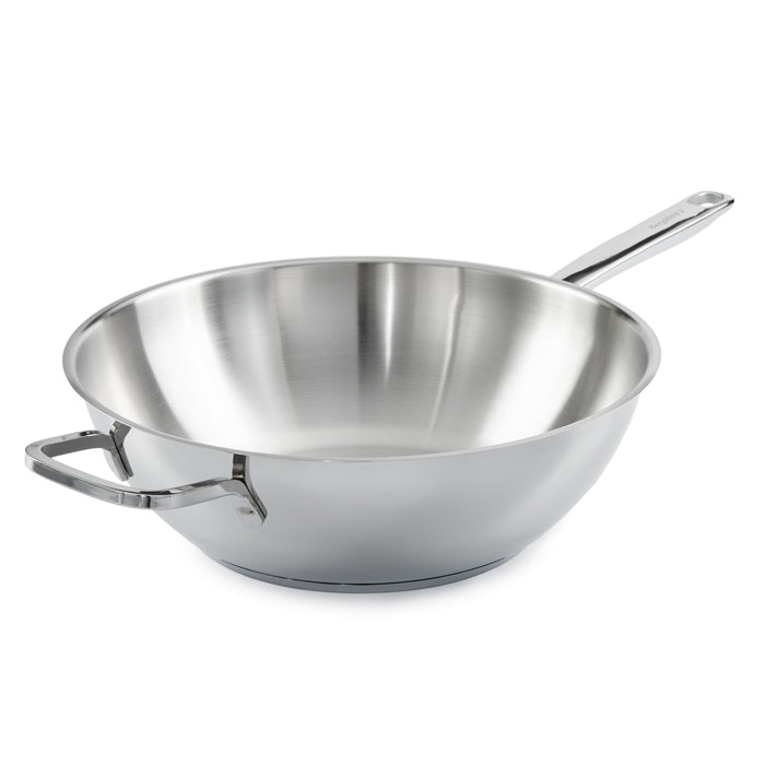 - Sustainable, recycled 18/10 stainless steel 12" Wok Pan 5.6qt. with helper handle and long, ergonomic comfort-grip handle. Hanging loop for easy storage.