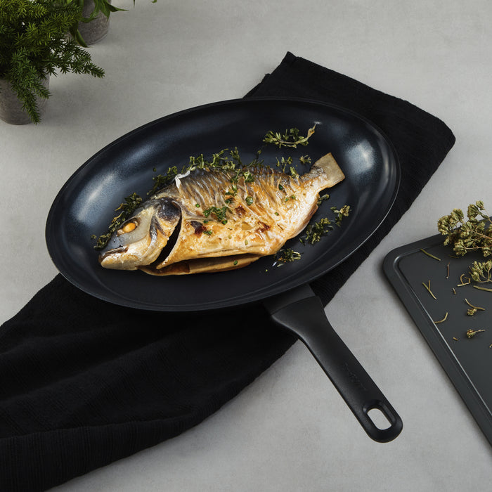 DiNA Helix Fish Pan 13.25" x 9.5" is the perfect pan to cook and serve your favorite fish dish. The oval shape of the pan is ideal for cooking whole fish or larger fillets, allowing for ample space to cook without overcrowding. Made from recycled aluminum and coated with a ceramic non-stick, nontoxic PFAS-free PTFE-free CeraGreen ceramic coating for easy food release and hassle-free cleanup. The full disk base and aluminum body heat the pan quickly and distribute the heat evenly. The ceramic coating means you don't have to use as much oil and the pan is easy to clean afterwards. The fish pan is suitable for any cooktop, including Induction, Electric, Gas, Halogen, Glass Top, and Vitro-ceramic. Whether you're a professional chef or a home cook, this nonstick fish pan is a must-have for preparing delicious and perfectly cooked fish dishes.