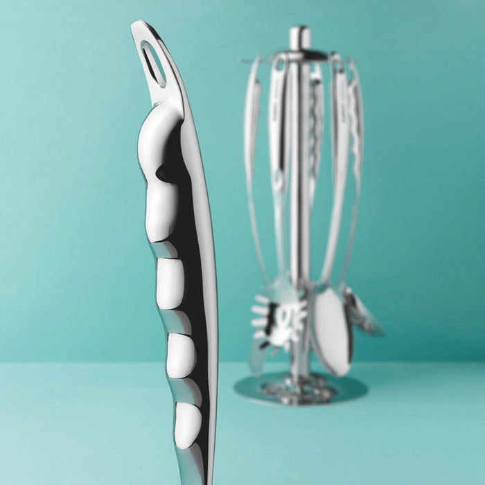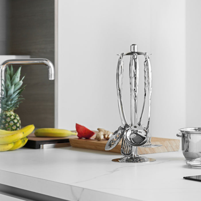 This 7-piece kitchen utensil tool set is a must-have for any cook. The 6 convenient kitchen utensils, made of 18/10 Stainless Steel, can easily be stored on the practical rack so you don't waste valuable drawer space and always have the best tools for everyday use at your fingertips.
