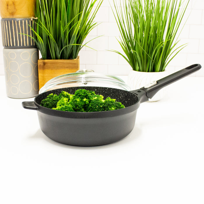- Made of Non-stick Ferno-Green, PFOA Free coating Cast Aluminum. Easily detachable handle that allows for use in the oven and space-efficient storage. Stay-cool handle, Glass lid with silicone rim-dripless pouring.