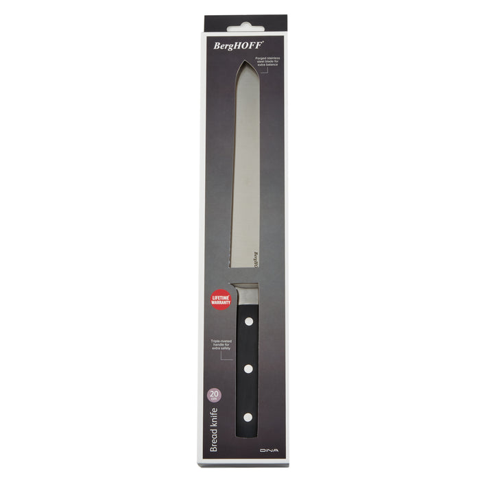 DiNA Gene 8" Bread Knife is crafted with precision and durability in mind. This knife is designed to effortlessly slice through even the crustiest of breads. The serrated edge of the blade allows for clean and precise cuts, ensuring that each slice is perfect. Who doesn’t love a slice of freshly-baked bread to start off the day? To make sure you can easily pierce the crispy crust without crushing the softer inside, just grab this forged serrated bread knife from your kitchen drawer and make nice and even slices. Made from a single piece of stainless steel that’s combined with a triple-riveted contoured handle, this bread knife will never let you down. Whether you're cutting through a loaf of freshly baked bread or a baguette, this knife will make the task effortless.