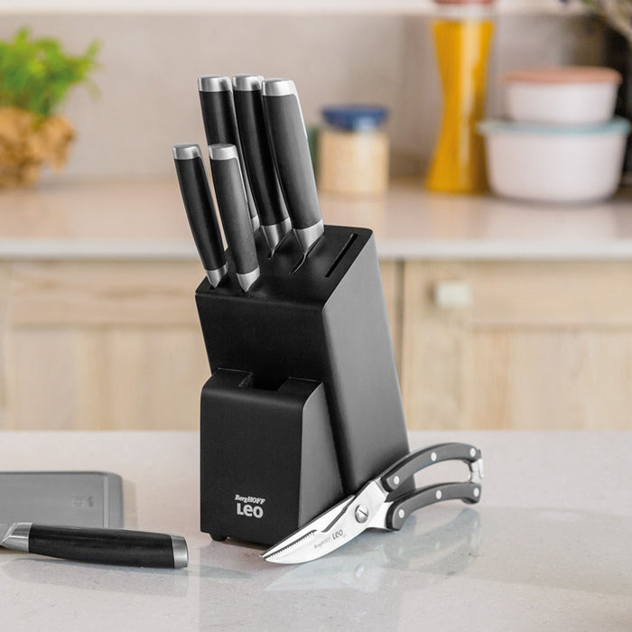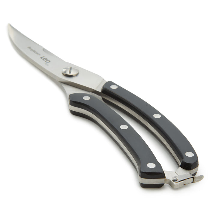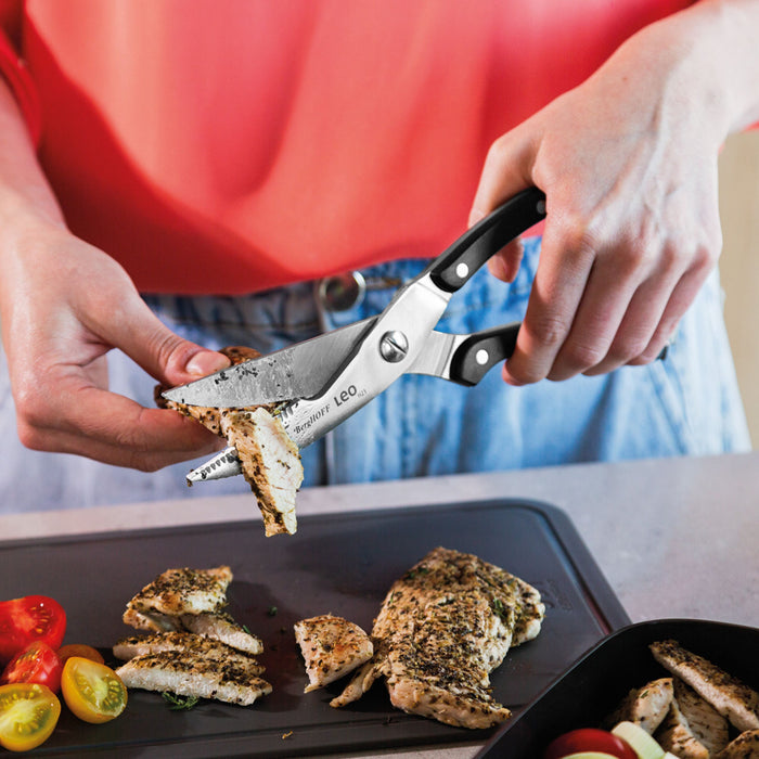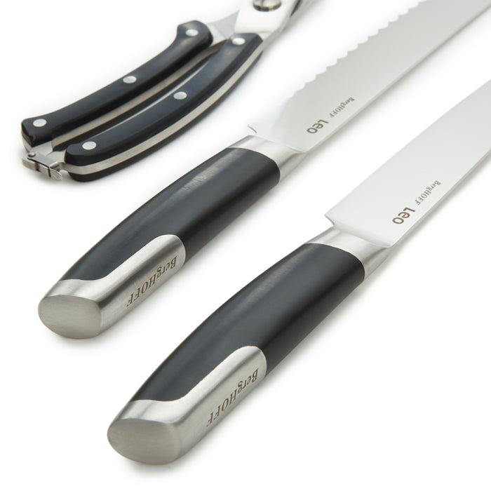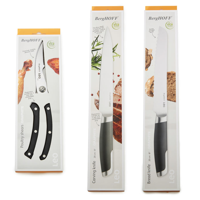 This Leo GRAPHITE 3Pc Stainless Steel Forged Cutlery Set is a must-have for any dinner party. The stainless-steel poultry shears are indispensable for precisely cutting raw, cooked, or fried poultry into smaller portions. For precise and silky-smooth carving of your roast, the top-tier stainless-steel carving knife is the ideal choice. Its high-quality X50CrMoV15 stainless-steel retains its sharp edge, effortlessly gliding through cooked meat and poultry. The bread knife is a versatile tool, capable of quickly slicing through both crusty bread and delicate tomatoes. Its serrated stainless-steel blade excels at cutting tough crusts without compromising the integrity of the final slice. Want to store the shears in your kitchen drawer? Just use the safety clip on the handles to keep your fingers safe. In addition, the ergonomic handles ensure a comfortable and safe grip, enhancing the slicing experience. This set includes Poultry Shears 9.75", Carving Knife 8", and Bread Knife 8".