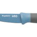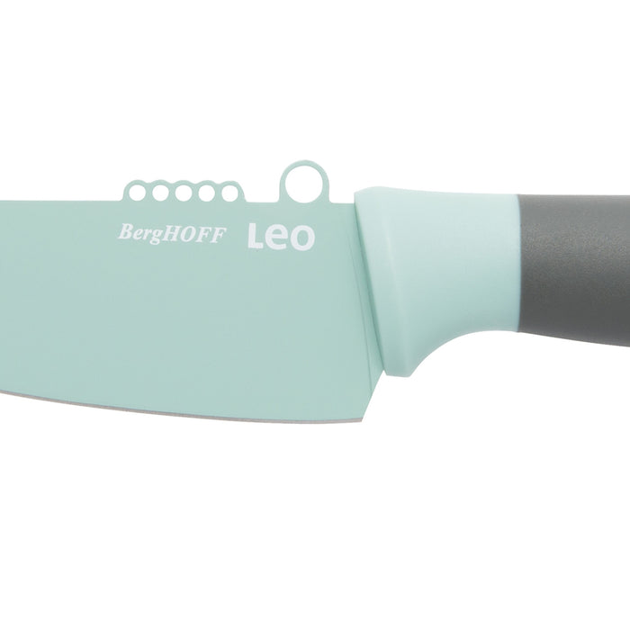 Package includes: 3.25" paring knife, 4.25" vegetable knife, 4.5" utility knife, and 5.5" chef's knife. With its sharp edge and comfortable soft-touch handle, the Leo paring knife is the perfect helper for small kitchen tasks such as mincing onions, peeling apples or segmenting oranges. Smaller than a chef’s knife but larger than a paring knife, the Leo utility knife is perfect for a wide variety of cutting jobs. The serrated blade with non-stick coating has no problem cutting through sausages, fruit skins or soft vegetables without crushing the softer inside. The small chef’s knife is the perfect example of a Leo tool, combining several functions in a single utensil while adding a colorful touch to your kitchen. The stainless steel knife with non-stick coating is great for various chopping tasks while the integrated herb stripper helps you to get a handle on stemmed herbs such as rosemary, thyme or sage. Just pull the stems through the fitted hole, strip the leaves and start chopping! The mint colored vegetable knife with non-stick coating glides right through all kinds of vegetables while the integrated zester allows you to add a fruity touch to your dishes as it zests limes, lemons and other citrus fruits