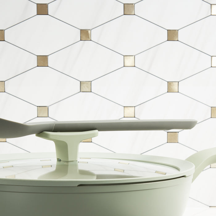Balance 5pc Cookware set combines 100% recycled aluminum with a sustainable CeraGreen ceramic non-stick coating, making it both eco-friendly and highly energy-efficient. Each pan is equipped with ergonomic soft-touch handles, making them easy to grip and maneuver, even when full of food. The long handle on the sauté pan provides added stability and control, while the fry pan and saucepan feature standard handles for easy lifting and pouring. The set also includes two glass lids, allowing you to monitor your cooking progress without releasing heat and moisture from the pans. Featuring a full disk bottom to ensure an even heat distribution and retention, this cookware is compatible with vitro-ceramic, gas, induction, electric, and glass cooktops. Whether you're a seasoned chef or just starting out in the kitchen, this 5pc cookware set is a must-have for anyone who values quality and convenience. Set includes: 7" Saucepan, 10.25" Sauté pan (long handle), 9.5" Fry pan, 2x Glass Lids.