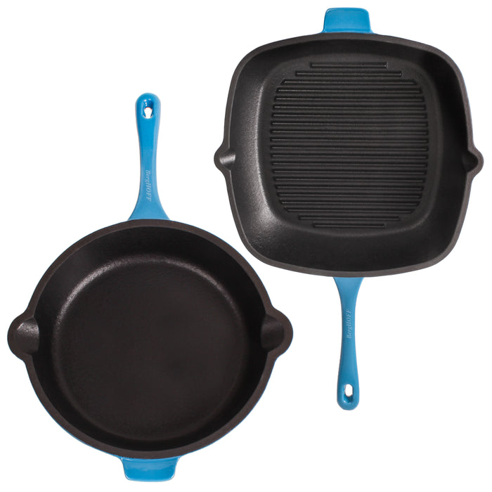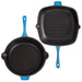 BergHOFF Neo 3pc Cast Iron Fry Pan & Grill Pan Set with Slotted Steak Press, Blue
