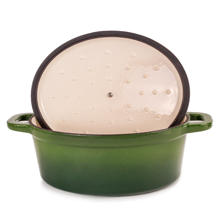 • Package includes: 10" Fry Pan, 11" Square Grill Pan, 5qt Oval Dutch Oven with Lid. Made of high quality and sturdy cast iron material. This set features a glossy base, an enamel coating on the outside and inside of the cookware, and includes ergonomically designed handles and matching vapor seal lid.