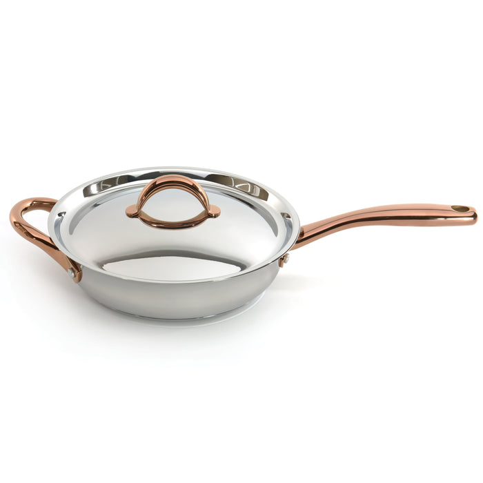 - Set includes 18/10 Stainless Steel 6.25" 2.5qt Saucepan, 8" & 9.5" Stockpot, 10" 3.1qt Deep skillet, 8" & 10" Fry pan, 9.5" Steamer insert, 4x matching lids, all equipped with rose gold handles. Includes bamboo 2x spatulas and 4x spoons.
