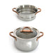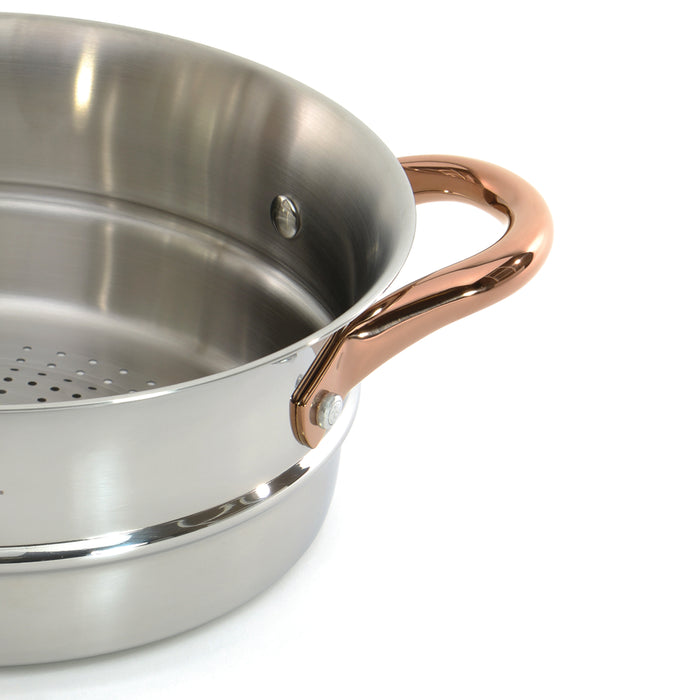 Ouro Gold 3pc Steamer Set is designed for the modern kitchen, crafted from high-quality, durable 18/10 stainless steel. This eco-friendly and sustainable set features elegant rose gold handles for a comfortable grip. Each piece includes a vapor-seal glass lid, designed without a vent to facilitate waterless cooking, which helps retain nutrients and flavor while ensuring energy-efficient performance. Effortlessly prepare a variety of healthy dishes, such as perfectly steamed vegetables, tender fish, and delicate dumplings. The 3-layered base provides even heat distribution across various cooktops, including Induction, Electric, Gas, Halogen, Glass Top, and Vitro-ceramic. This set combines practicality with stylish design, making it an essential addition for healthy and efficient cooking. Package includes: 10" Steamer, 9.5" Stockpot 8.1qt., and a glass lid, Silver & Rose gold