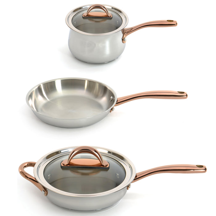 Ouro Gold 5pc Cookware Set combines elegant design with top-notch functionality. This set is crafted from hygienic 18/10 stainless steel with a striking mirrored finish. The set features stylish rose gold accents on the handles, adding a unique touch to your kitchen. Designed for professional-quality cooking and effortless cleanup, this versatile set is perfect for a range of dishes. Use the fry pan for perfectly crisp bacon and seared steaks, the saucepan for boiling pasta, simmering sauces, or preparing soups, and the deep skillet for stir-fries, sautés, deep-frying, and more. The included glass lids let you monitor your cooking while retaining heat. Built to endure a lifetime of heavy use, this durable cookware features ergonomic, double-riveted stainless steel handles for a secure grip. Suitable for all cooktops such as vitro-ceramic, gas, induction, electric, and glass top, the 3-layered bottom ensures even heat distribution. Hand wash recommended. Package includes: 9.5" Fry Pan, 6.25" Saucepan with Glass Lid, 10" Deep Skillet with Glass Lid