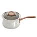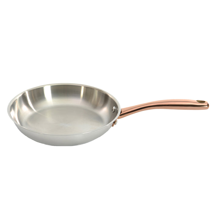 - Package includes: 9.5" Fry Pan, 6.25" Saucepan, 10" Deep Skillet, 2x Glass Lids. Crafted from high-quality 18/10 Stainless Steel with a sleek mirror finish and features ergonomically designed rose gold handles for a firm, secure grip.