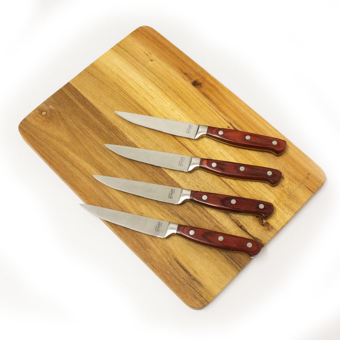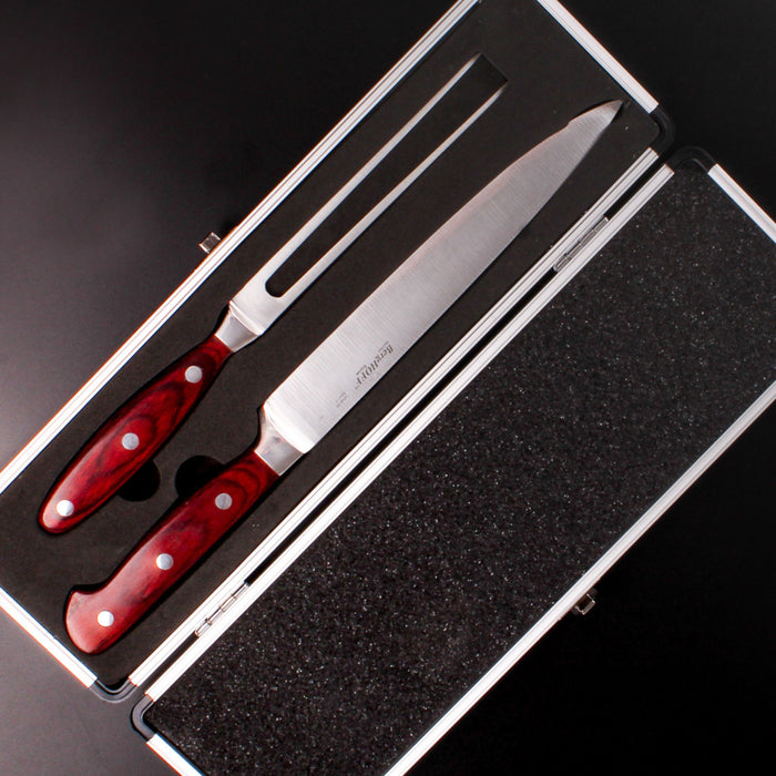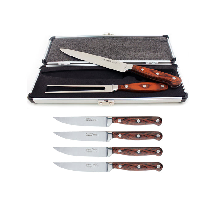 - 18/10 Stainless steel 4x Steak knives, Carving fork, Carving knife with ergonomic, triple riveted handles. Includes aluminum storage case.