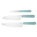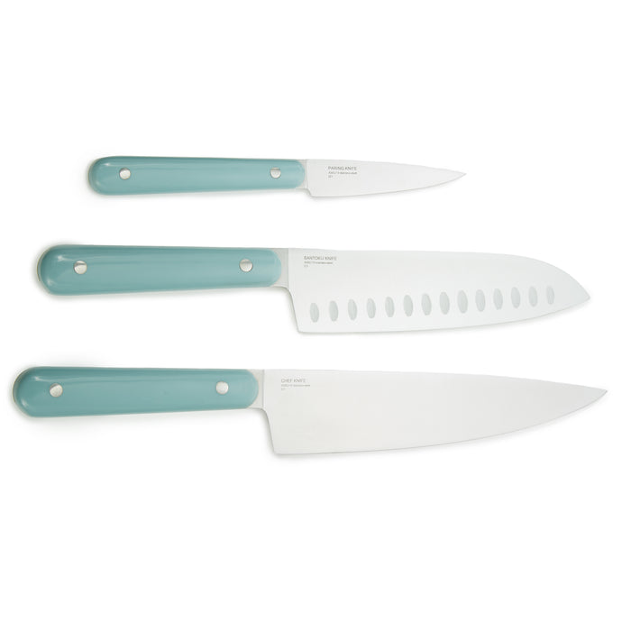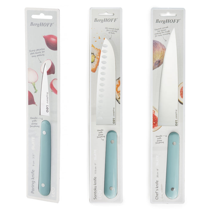 No matter how extensive your knife collection may be, you’ll find yourself reaching for this Leo Slate 3Pc Stainless Steel Cutlery Set every time again. Slicing, dicing, and mincing is what this Japanese-style knife does best. A chef’s knife is one of the most important tools in any kitchen. Meat, vegetables, or poultry, this chef’s knife cuts it all and thanks to the wide, sharp blade it’s also suitable for light cleaving jobs. Peeling a hot potato, cutting thin julienne strips, or deveining shrimps, whatever cooking task is waiting for you, this paring knife is ready to lend a hand. Thanks to its smaller and slightly curved blade, it’s a great tool for those precision tasks. These knives are made from high-quality stainless steel with stunning glossy handle looks fierce in every kitchen. Choose between two matching colors and brighten up your kitchen with these glossy finishing knives. This set includes Chef's Knife 8", Paring Knife 3.5", and Santoku Knife 7".