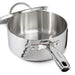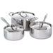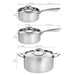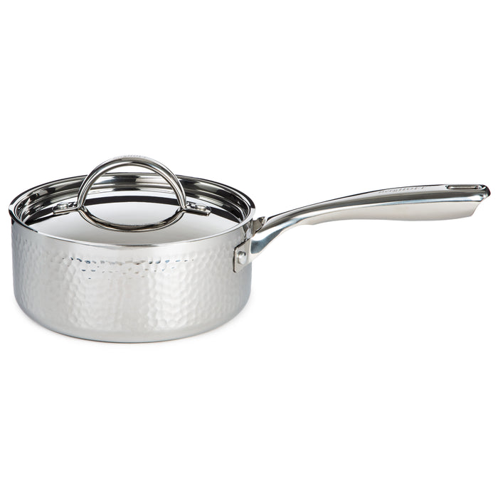 - Set includes tri-ply 18/10 Stainless Steel 7" Saucepan 2qt., 8" Saucepan 3qt., 9.5" Saucepan 5.75qt. with hammered design and ergonomically designed comfort-grip handle. Includes 3 matching lids.